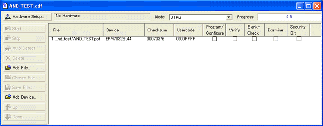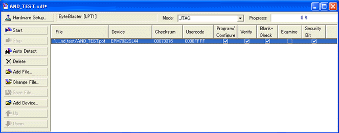 6−5. 先ほどの画面の上段を見ると、ByteBlaster設定されたことが分かります。また、その右のMode欄にJTAGになっていることも確認しておきましょう。この設定は、他のプロジェクトにも引き継がれます。 |