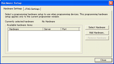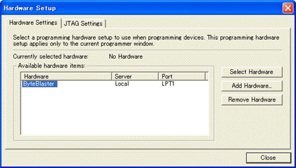 6−4. 先ほどのHardware Setup画面にByteBlasterが追加されているので、クリックしてハイライト状態にしておいてからSelect Hardwareボタンを押し、Closeボタンで窓を閉じます。