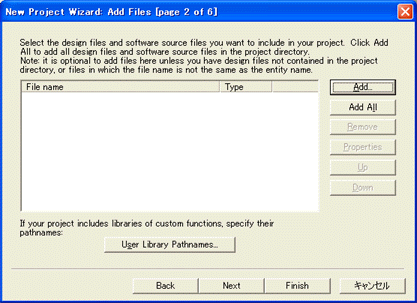 1−5. 次に、すでに作られているファイルなどがある場合には、ここで指定してプロジェクトの仲間として登録します。VHDLのソースファイルなどは、予め類似のソースファイルをコピーして入れておくと後の登録作業を省略することができて楽です。 Nextボタンで先に進みます。