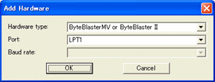 6−3. Hardware type欄にByteBlasterを、Port欄に接続するパソコンのプリンタポート番号を設定してOKボタンを押します。大抵のパソコンにはプリンタポートはひとつしか付いていないと思うので、LPT1で良いかと思います。 |