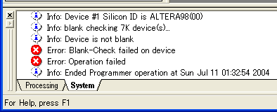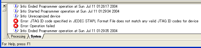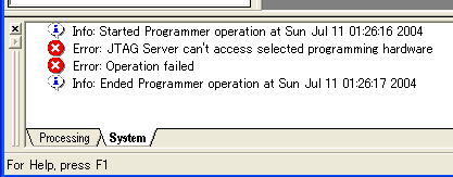 7−4. またまたついでに、CPLDが載った基板は接続するのですが、そのターゲット基板に電源を入れなかった場合は、以下のようなエラーメッセージが表示されます。
