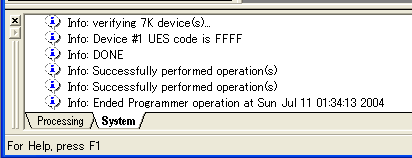 7−1. 先ほどのHardware Setupを行った画面からスタートします。メイン画面のメニューバーから Tools → Programmer を実行して下さい。ダウンロードしたいファイルをクリックしてハイライト状態にして、右側の□の中をクリックしてチェックマークを付けましょう。そして画面左側のStartボタンを押します。 |