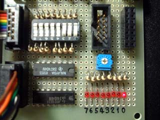 8−2. 左の写真がスイッチ部分とLED部分の拡大写真です。 ディップスイッチの1,2,3がそれぞれ入力信号a, b , cに相当します。写真の状態は全ての入力信号が1の状態を示しており、このときLEDの0bit目(出力y)が1になり点灯してることが分かります。スイッチの1,2,3のいずれかを操作して0にすると、LEDも消灯します。