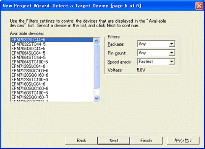 1−8. 次に、1−7.項で指定したシリーズから、更に詳細なデバイスの指定を行います。右横のFiltersで候補を絞ることもできます。ここでは、EPM7032SLC44-5を指定しました。 入力が終わったらNextボタンで先に進みます。