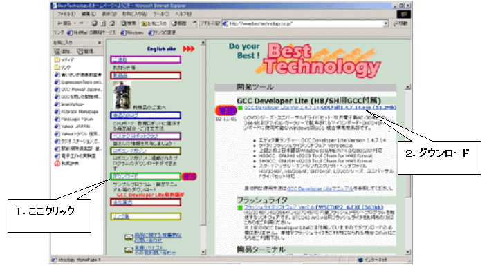 ボケボケ画面ですみません。ベストテクノロジーのホームページに行ったら、先ずダウンロードページに行くために、「1.ここクリック」で示しているボタンを押します。次に、右側の窓をスクロールして行き、「開発ツール」 GCC Developer Lite の項目を表示させます。あとは、「2.ダウンロード」で示している部分をクリックすればダウンロードできます。