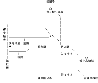 「*」から鬼ノ城のふもとまでが4キロくらい。