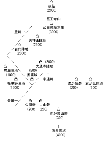 を参考にしました。ただ、鳶が巣山砦の人数はちょっと自信なし。