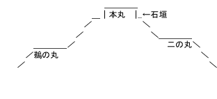 本丸を中心に4つの尾根に向かってそれぞれ三の丸、鵜の丸、大阪丸、馬場の下