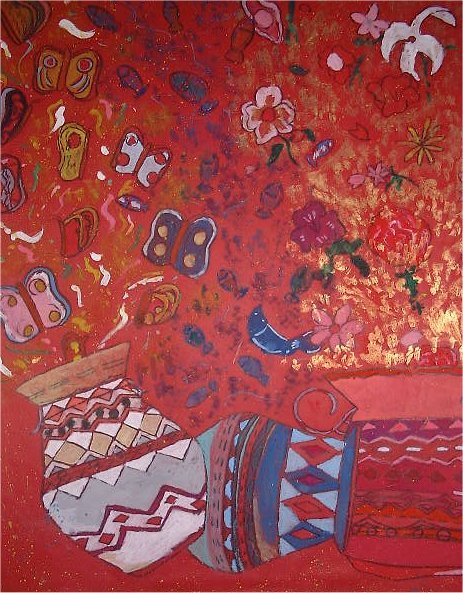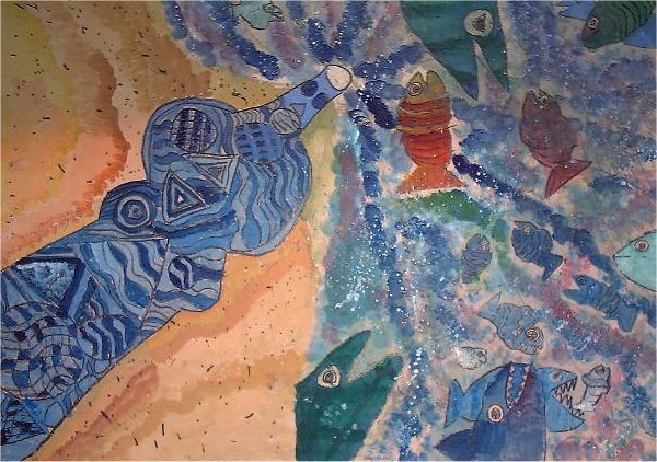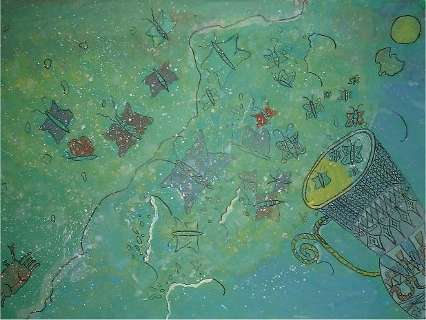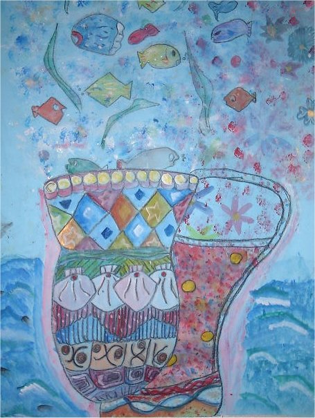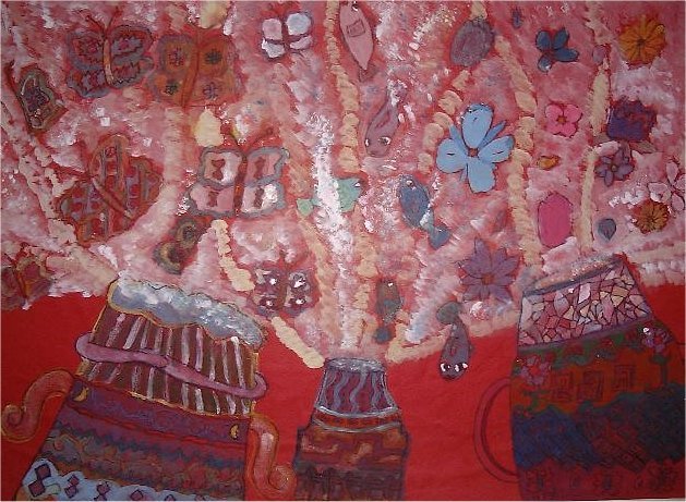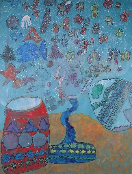 作品名〜物語の絵その2「つぼからけむりが」 6年生の作品です。話は「お話の絵の世界」〜川合美音著(日本文教出版株式会社)P30,31を使用しました。