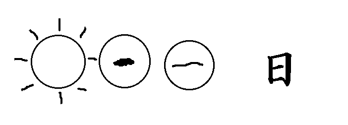 2.丸からだんだん四角に変わり,「口」という字になりました。けれども,お日さまはただの丸じゃないよということで点を入れました。そうして,「日」という字になりました。