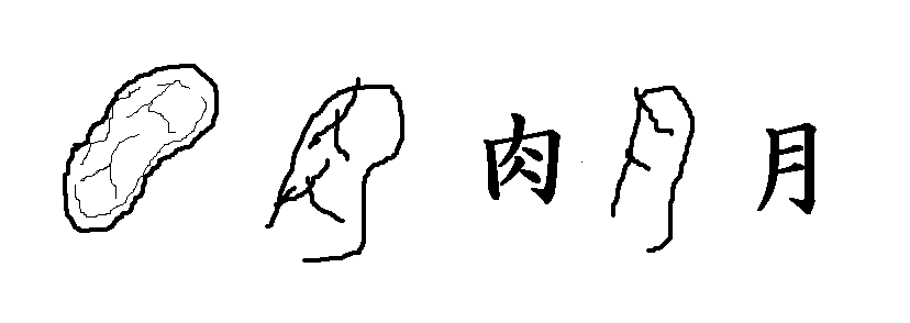 3.この「月」は「にくづき」とよばれる部首です。「にくづき」は,肉や体に関係した漢字に使われます。例えば,「胃」なんかもそうですね。他にどんな漢字があるでしょう。にくづきが付く漢字をできるだけたくさんノートに書きなさい。3つ書けたら持ってらっしゃい。