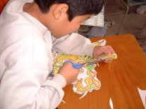 | ⑦できあがり〜ワンポイントでちょっぴり味付け デジカメで撮っておいた個々の顔写真を自分の人形(ひとがた)に貼り付けて出来上がり! (ある子が、ポスターから切り取った世界の国旗を胸の部分に糊付けしていたのを見て、全員「ぼくもわたしも」ってことで国旗を貼り付けていました。 かくして多国籍の「Wee are the world」が出来上がりました。) 作品に上手い下手はありません。壁画を見上げる子供たちの表情は、どの子も満面の笑みでした。 |