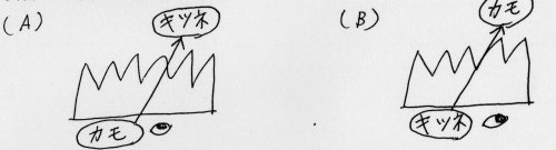 ・やぶの「むこう」にいるカモと書いているから、向う側はカモ。