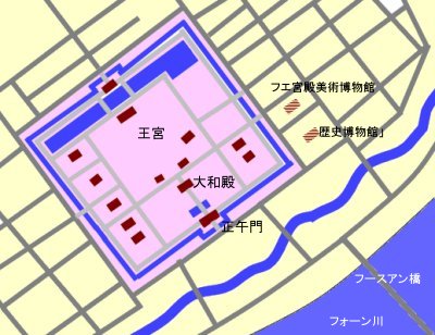 ベトナム中部のフエはベトナム最後の王朝グェン王朝(Nguyen)の都があった町です。グェン王朝は1802年から1945年まで続きました。にぎやかな南部の町並みとは少し違い、古き良きベトナムの香りがする町と言えるかも知れません。実際、陽気な南部のベトナム市民と比べて、フエの人々は人懐こくて優しい人が多いと言われています。 フエの町はフーン川を挟んでフエ王宮側と新市街地に分かれています。ホテルや旅行社などの施設は新市街地にあり、グエン王朝の王宮や古い店や建物は、旧市街にあります。このため、海外から来た観光客は新市街にあるホテルに宿泊し、タクシーなどを利用して旧市街に行き、王宮や宮殿博物館などを見学するようになります。 ハスの花が浮かぶ堀に囲まれた王宮の正午門をくぐると、橋を渡って大和殿にいたります。遥かな昔と思いがちですが、1世紀から2世紀ほど前までは、この王宮がベトナムの政治の中心として使われていたのです。ほんの少し神秘的な心持で大和殿を見学すると、広い広い王宮の内部にいたります。急ぐ旅でなければ、半日くらいの余裕を持って見学をすると良いと思います。 王宮のそばにある宮殿博物館も、とても興味深いグエン王朝の家具や衣装などの展示を行っていますので、是非覗いて見て下さい。その横にある歴史博物館には、フエの歴史が写真や展示品で紹介されています。前庭にはベトナム戦争で実際に使用された戦車や大砲などの実物が展示されていますので、興味のある人はどうぞ。 ![]() また、グエン王朝の歴代の皇帝が作り上げた廟もフエの郊外に点在しています。中でも状態よく保存されているのが、トゥードゥック帝廟、カイディン帝廟、ミンマン帝廟です。これらの皇帝の歴史はこちらを参照してください。 各廟へのツアーは、ツアー会社やホテルなどで手配できます。また、ハノイやホーチミン市の旅行社でも手配できます。一日のツアーになりますが、フエ観光の目玉ですから是非見学することをお勧めします。 ところで、せっかくフエに来たのですから、是非フエ料理を味わって帰ってください。お勧め料理のは、フエ王宮料理が一番ですが、それ以外にも、フエ独特のお惣菜単品料理は美味しいものが沢山あります。小皿で出てくるものが多いので、ビールのつまみにもぴったりの料理だと思います・・・(笑。フエ料理の参照ページはこちら。 <フエへの行き方と旅行アドバイス> ハノイやホーチミン市からは飛行機で行きます。そしてフエ空港から市街地まではタクシーで20分程度の距離になります。ベトナム航空 冬のフエは気温も低く、天候の悪い日が多いので、長袖衣類や雨の対策をあらかじめしておいたほうが良いと思います。 ![]() フエの見所: 1)グェン王宮(Dai Noi):中国の王宮建築の様式を取り入れた王宮。戦争中に破壊されたかしょもありますが、今でも当時の王朝の雅さを偲ぶことが出来ます。敷地が広いので、見学には半日程度の時間を見ておくと良いと思います。 2)フエ宮殿美術博物館(Bao tang My thuat Cung dinh Hue):グェン王宮の宮廷で使用された物を展示しています。王室の家具や装飾品などを見ることができます。 3)ミンマン帝廟(Lang Minh Mang):フエ市内からフォーン川を12km下ったところにある。1841年に建造され、美しい庭園や建築が見所です。 4)トゥドック帝廟(Lang Tu Duc):旧市街からミンマン帝廟へ向かう途中に有る。1867年に建造されました。 5)カイディン帝廟(Lang Khai Dinh):1931年建造された西洋風のデザインを取り入れた廟。完成までに12年かかりました。 <フエ観光のための参照> フエ旅行記はこちらを参照ください。 フエフォトツアー1:2 ホテル案内