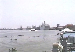 川に沿ってここから海まで延々と貨物船の列が続いているのです。