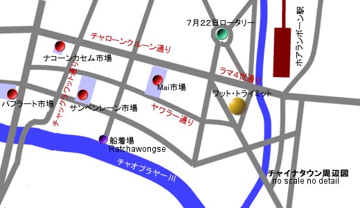 ![]() ■チャイナタウン案内 ![]() バンコクのホアランボーン駅の西側からチャオプラヤー川にかけてチャイナタウンが広がっています。チャイナタウンはチャオプラヤ川の対岸トンブリからバンコクに首都が移転されるとともにこの地区に中華系の人々が移されて来たのが始まりでした。現在はMai市場、Nakhorn Kasem市場、Sampeng Lane市場、Pahurat市場などを中心に、中華の文化圏が広がっています。 ホアランボーン駅を出てすぐにあるのがワット・トライミット(Wat Traimit)黄金仏寺院です。1238年に建設された寺院で、中に黄金の仏像があることで有名です。この仏像はもともとバンコク市内の別の漆喰で覆われていたごく普通の仏像と思われていましたが、1953年にこの寺に移設されるときになって、運搬時に外側を覆っていた漆喰が剥がれ落ちて、中から黄金の地肌が出てきたということです。重さ5.5トンの黄金仏で、時価総額およそ120億円といわれています。 黄金寺院を出てラマ4世通りからチャローンクルーン通りを西に歩くとマイ(Mai)市場に出ます。食料品を扱う市民の台所的な市場です。ラマ4世通りの北にある7月22日ロータリー周辺はバックパッカーが集まる安宿が集まっています。 チャローンクルーン通りをもう少し西に歩くとナコーンカセム(Nakhorn Kasem)市場通称ドロボー市場と呼ばれるガラクタ市場があります。そばに通るチャックラワット(Chakkrawat)通りには、電気屋さんが集まっています。 ドロボー市場からみて南側にはサンペンレーン(Sampeng Lane)市場とパフラート(Pahurat)市場があります。Sampeng Lane市場は通りに出来たごみごみとしたアーケードスタイルの市場で、日用雑貨品や衣料品などを売っている店が並んでいます。 Pahurat市場のほうは、タイの伝統衣装などを扱う店やそのほかの衣料品、雑貨などを売る店や露店が路地に並ぶ、アーケードスタイルの市場です。 暑い日差しや気温と戦いながら中華街を歩くと、中華系の人々の活気に圧倒される思いがします。ここでしか出会えないディープで面白い逸品に出会えるまで、じっくりと通りを歩いてみましょう。くれぐれもスリやドロボーに気をつけながら歩いてください。 ![]() |