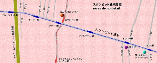 スクンビット通りを大雑把に言うと、ソイ3番ではアラビア人が多く住むアラブ街、ソイ11番ではインド人街、ソイ12〜21はショッピングセンターや高級ホテルの並ぶ繁華街、ソイ21〜33は高級住宅街、在留日本人はソイ24、ソイ33あたりに多く住んでいます。