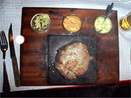 石焼ステーキ。ガンガンに熱した石の上でにんにくとマーガリンで